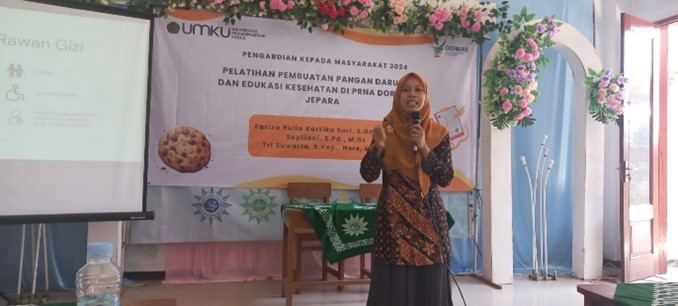 Materi pertama disampaikan oleh Bapak Tri Suwarto, S.Kep.,M.Kep.,Ners, tentang penyakit yang timbul akibat banjir dan penyakit degeratif seperti Diabetes Militus dan Hipertensi. Materi yang kedua adalah pelatihan pembuatan Pangan Darurat disampaikan oleh Ibu Septiani,S.Pd.,M.Gz. Beliau memaparkan materi tentang kriteria pangan darurat dan jenis pangan darurat yang dapat di buat dengan mudah di rumah. Produk pangan darurat yang dibuat adalah Mocoo (Mocaf Cookies) yaitu cookies coklat yang terbuat dari substitusi tepung mocaf. Tepung mocaf dipilih karena mengandung beberapa kelebihan dibandingkan dengan tepung terigu, yaitu kadar mineral yang lebih tinggi dan bersifat probiotik. Ketua tim Pengabdian kepada Masyarakat Universitas Muhammdiyah Kudus, Ibu Fariza Yulia Kartika Sri, S.Gz.,M.Si dalam sambutannya menyampaikan ucapan terima kasih kepada PRNA Dorang yang berkenan bersinergi dengan UMKU dan berharap bahwa kegiatan tersebut dapat bermanfaat bagi seluruh peserta.