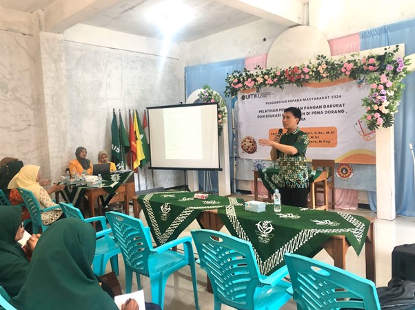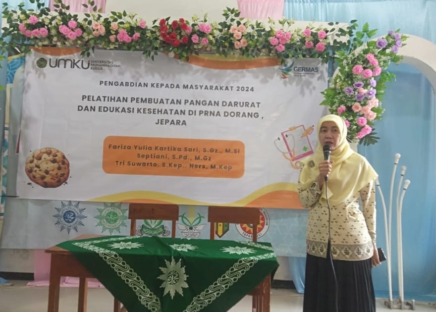 Acara tersebut di selenggarakan oleh tim Pengabdian kepada Masyarakat Universitas Muhammadiyah Kudus yang terdiri dari Dosen Prodi S1 Gizi yaitu Fariza Yulia Kartika Sari, S.Gz.,M.Si dan Septiani, S.Pd.,M.Gz, serta Dosen profesi Ners, yaitu Tri Suwarto, S.Kep.,M.Kep.,Ners, beserta tiga mahasiswa dari prodi S1 Gizi yaitu Laily Widya Safitri, Melinda Yuslian dan Hanifah Miftahul Jannah. Dalam sambutannya, ketua Pimpinan Ranting Nasyiatul Aisyiyah Dorang, Ayunda Susi Handayani, S.Pd menyampaikan bahwa kegiatan ini bagus untuk dilakukan di PRNA Dorang, mengingat bahwa dalam kondisi banjir yang selama ini terjadi, makanan merupakan hal yang menjadi perhatian utama, beliau juga mengharapkan bahwa pelatihan pangan darurat ini nantinya dapat diimplementasikan sebagai langkah awal tanggap bencana dan dilakukan kegiatan yang berkelanjutan,. Selanjutnya, Bapak Taufiq Nugroho Noor, S.Sos.,S.Pd selalu Pimpinan Ranting Muhammadiyah Dorang menyambut dengan hangat kedatangan dari tim PkM Dosen UMKU. Dalam sambutannya, beliau menyampaikan bahwa dengan adanya kegiatan ini dapat menyimbolkan bahwa perguruan tinggi tidak hanya menjadi menara gading yang bersinar di tempat yang tinggi, namun juga mampu memperkuat akar-akar di Pimpinan Ranting agar semakin kokoh dan kuat baik secara fisik maupun mental. Beliau juga mengharapkan, kegiatan seperti ini dapat diadakan lagi dikemudian hari di Amal Usaha Muhammadiyah lain di bawah Pimpinan Ranting maupun Cabang Nalumsari baik itu sekolah maupun pondok pesantren.