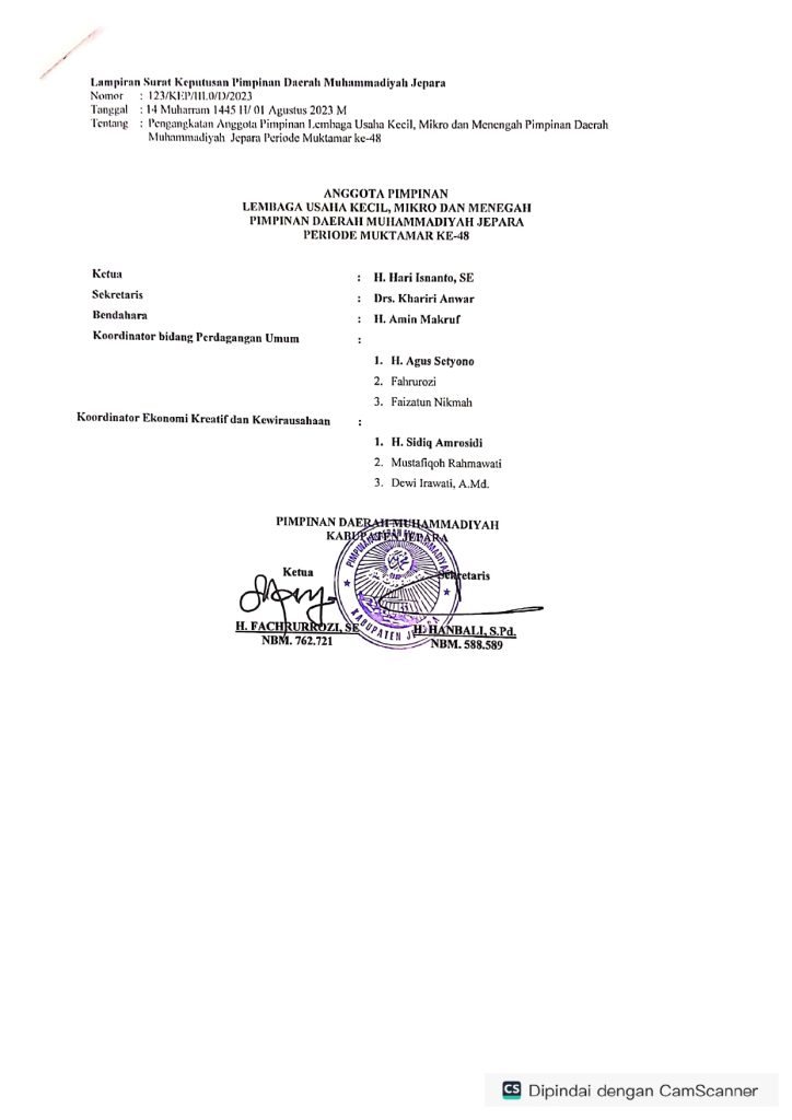 SUSUNAN LEMBAGA Pengembangan Usaha Mikro Kecil dan Menengah PIMPINAN DAERAH MUHAMMADIYAH JEPARA PERIODE MUKTAMAR KE 48