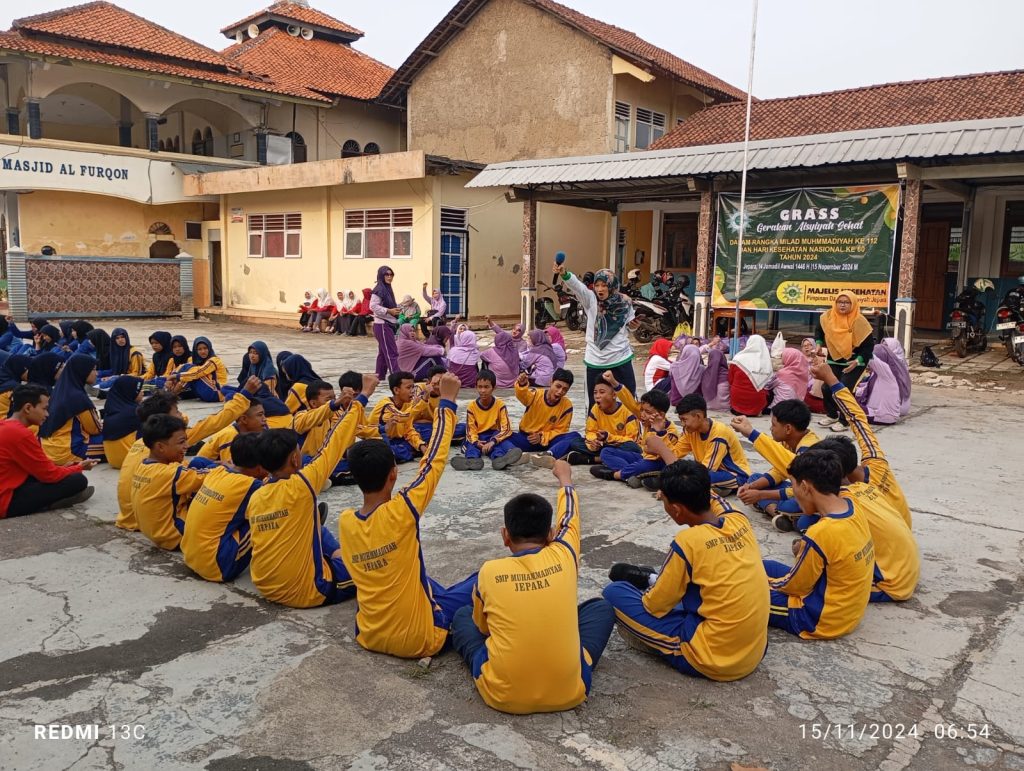 JEPARA (JEPARAMU.OR.ID) – Jum’at , 15 November 2024 dalam rangka Milad Muhammadiyah ke 112 dan Hari Kesehatan Nasional ke – 60 , Majelis Kesehatan Pimpinan Daerah Aisyiyah Jepara, bekerja sama dengan SMP & SMA Muhammadiyah jepara menyelenggarakan kegiatan dengan tema : Membumikan Gerakan Aisyiyah Sehat ( GRASS ) . Kegiatan yang dilaksanakan dilapangan perguruan Muhammadiyah Jln. KH. Moeliki pengkol Jepara di mulai pukul 06.00, dengan rangkaian kegiatan pembukaan, sambutan ketua MKes, Senam ‘Aisyiyah Bahagia, Penyuluhan Kesehatan, makan buah dan minum Tablet Tambah Darah bersama dan juga disediakan sarapan pagi. Seluruh peserta yang berjumlah kurang lebih 200 peserta yang terdiri dari siswa – siswi SMP – SMA Muhammadiyah Jepara di tambah para dewan guru dan ibu – ibu Aisyiyah dari Pimpinan Daerah,Cabang dan Ranting sangat antusias mengikuti acara pagi itu.