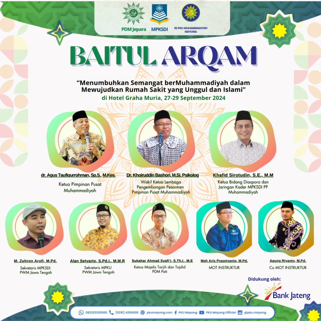 RS PKU Muhammadiyah Mayong (RSPUMA) mengadakan Baitul Arqam (BA) ke II dengan MPKSDI PDM Jepara pada tanggal 27-29 September 2024 di Hotel Graha Muria Kudus. Kegiatan yang berlangsung selama tiga hari insyaAllah akan diikuti pegawai mulai dari dokter hingga tenaga non medis sebanyak 56 Pegawai.