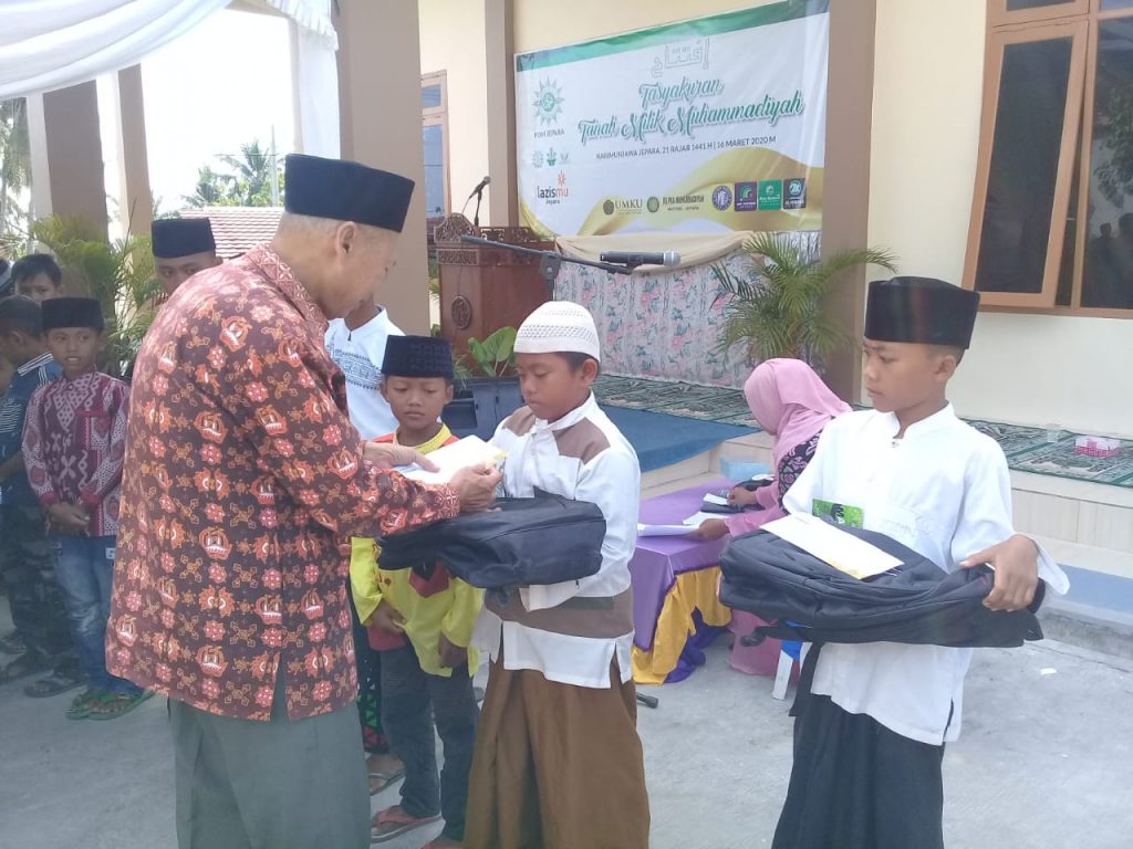 Ketua PDM Jepara KH. Fahrurrozi memberikan santunan kepada anak yatim piatu saat tasyakuran tanah milik Muhammadiyah Senin (16/3/2020) di Dk Alang-Alang, Karimunjawa. (DIAN R.A/JEPARAMU.OR.ID)