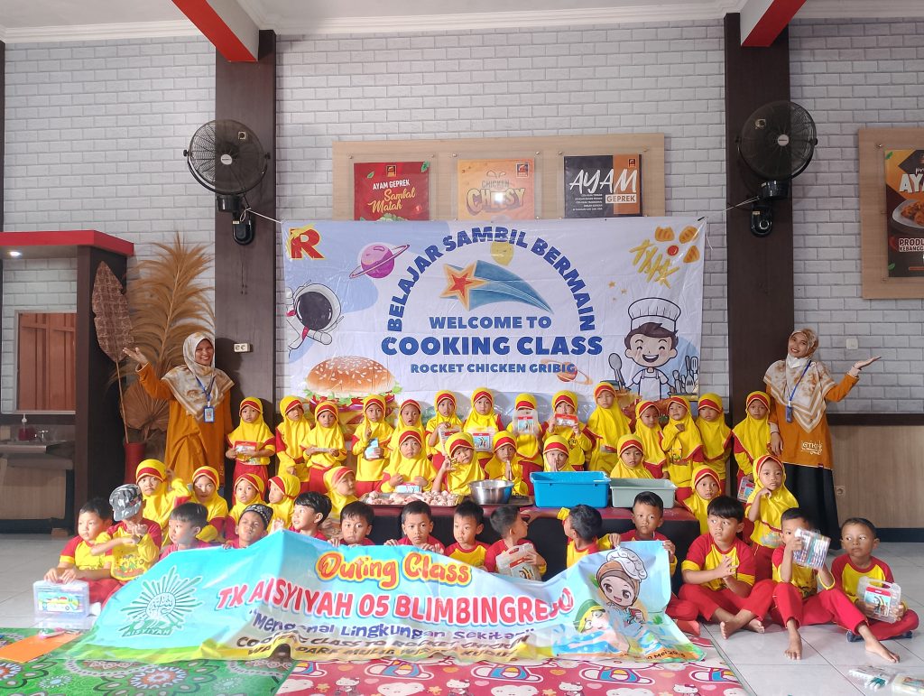 Dengan menggunakan 13 armada mobil angkot, rombongan berangkat menuju lokasi pertama di Rocket Chicken Gribig Kudus. Di sini, kegiatan dibagi menjadi dua kelompok. Kelompok A mengikuti kelas memasak/ cooking class, dimana anak-anak diajak mempraktikkan cara membalut daging ayam bagian paha ke dalam tepung, kemudian meniriskannya di wadah yang disediakan. Sementara itu, Kelompok B mengikuti lomba mewarnai gambar yang dilaksanakan di lantai dua, didampingi oleh kakak-kakak pegawai Rocket Chicken.